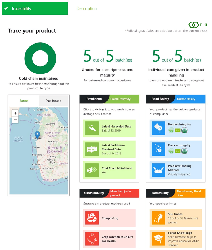 The map pinpoints the locations of farms where the product is grown and pack houses where it is packed. The information provided under the 4 dimensions are fully customizable including the data that are displayed under each card.